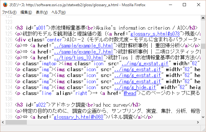 統計用語集の「ア行」を表示し、ブラウザ上で右クリックしてソースを表示します。すると、こんな記述がみられます。
